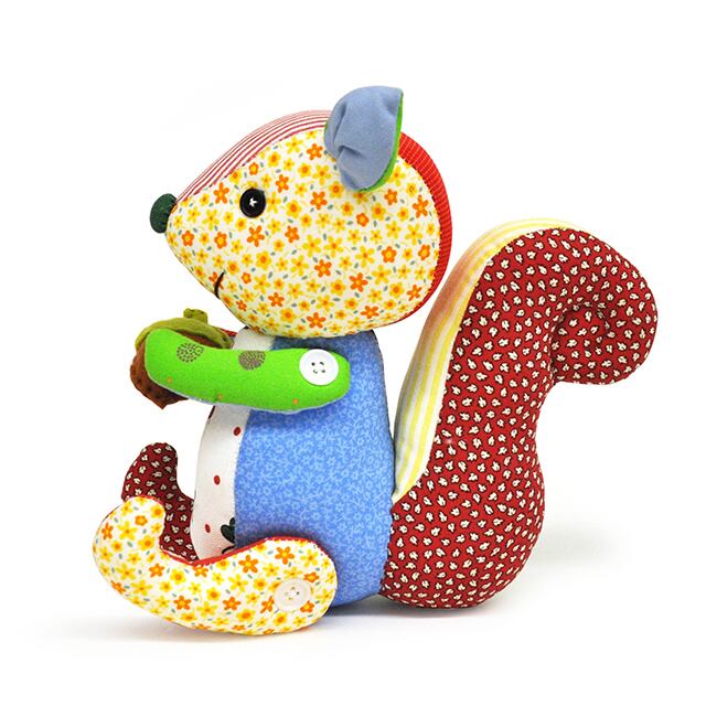 The theme of HAPPY TOYS released in 2003 was "a happy present for the future." Some of the acorns buried by squirrels for food eventually grow into trees and become a gift that produces future forests. Put together pieces of fabric that you like to make a one-of-a-kind squirrel.